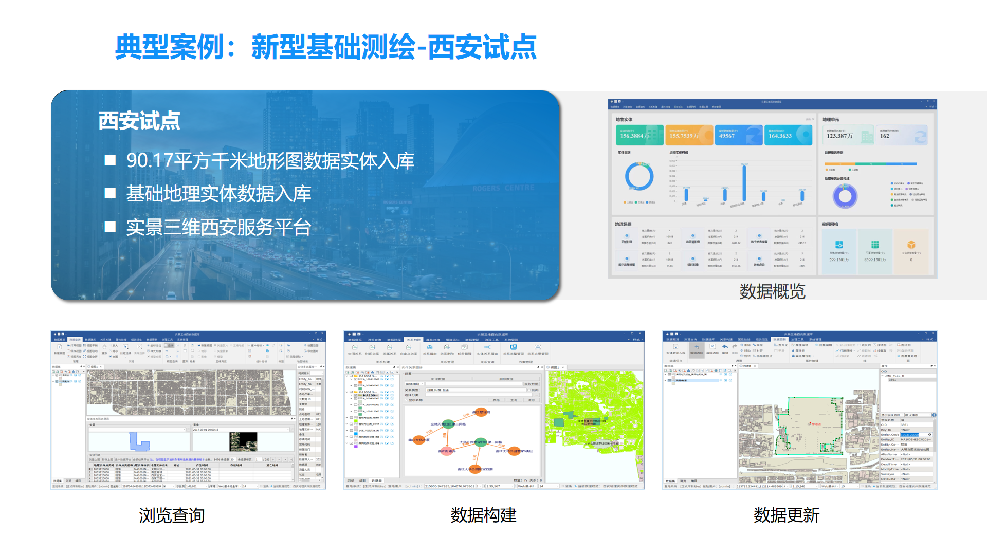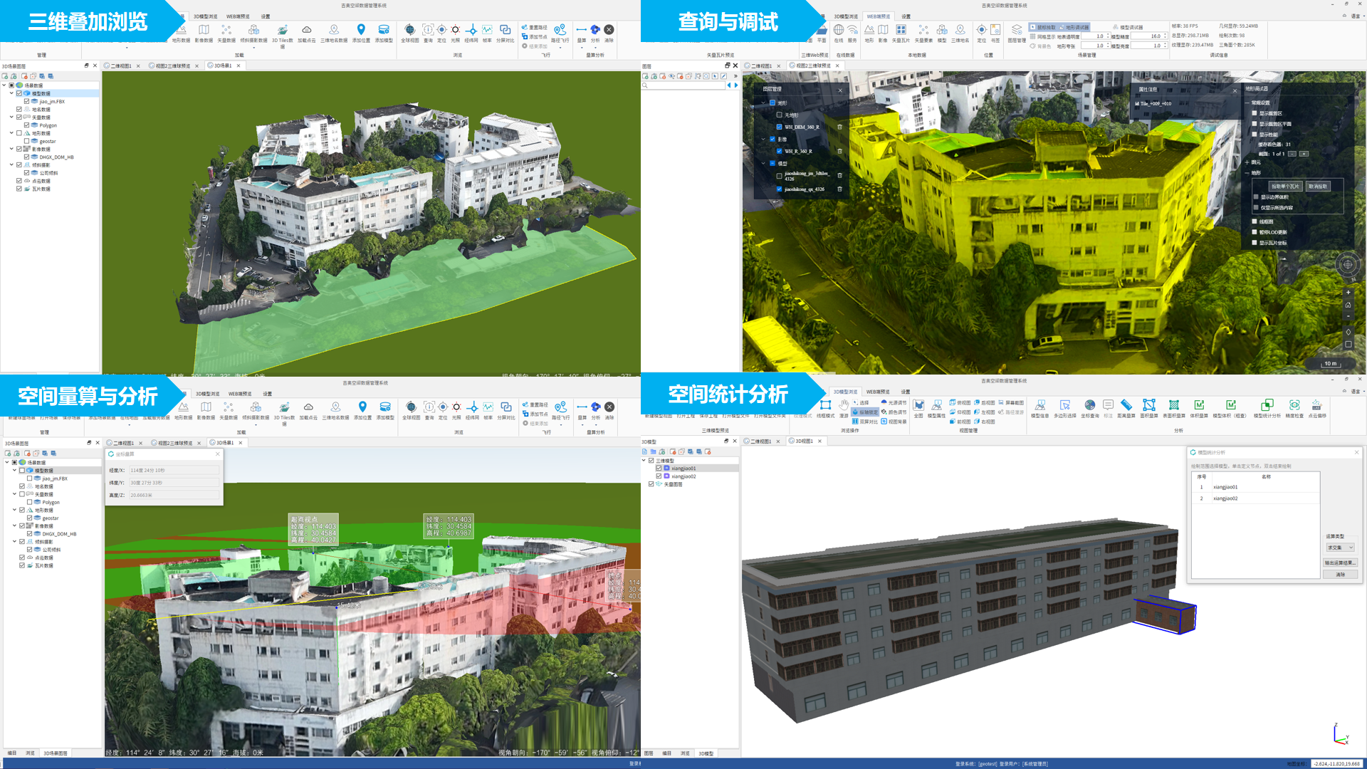 GeoDBMS满足空间数据为核心的时空数据建库与管理;提供各类二三维时空数据的质量检查、编目组织、输入输出、查询检索、更新维护、浏览查询、统计分析、制图输出等核心能力,满足数据集成化存储管理应用需求。